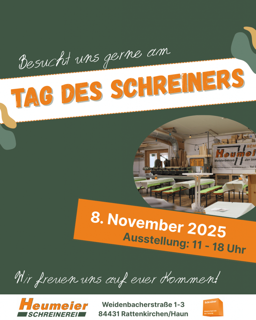 Erleben Sie echtes Handwerk hautnah beim Tag des Schreiners. Besuchen Sie uns und tauchen Sie ein in die Welt der Holzverarbeitung. Unsere Experten zeigen Ihnen live, wie aus Holz individuelle Möbelstücke und Einrichtungsgegenstände entstehen. Lassen Sie sich von spannenden Vorführungen, interessanten Gesprächen und jeder Menge handwerklicher Leidenschaft begeistern. Ein Tag voller Inspiration und Einblicke in unser traditionsreiches Handwerk erwartet Sie.